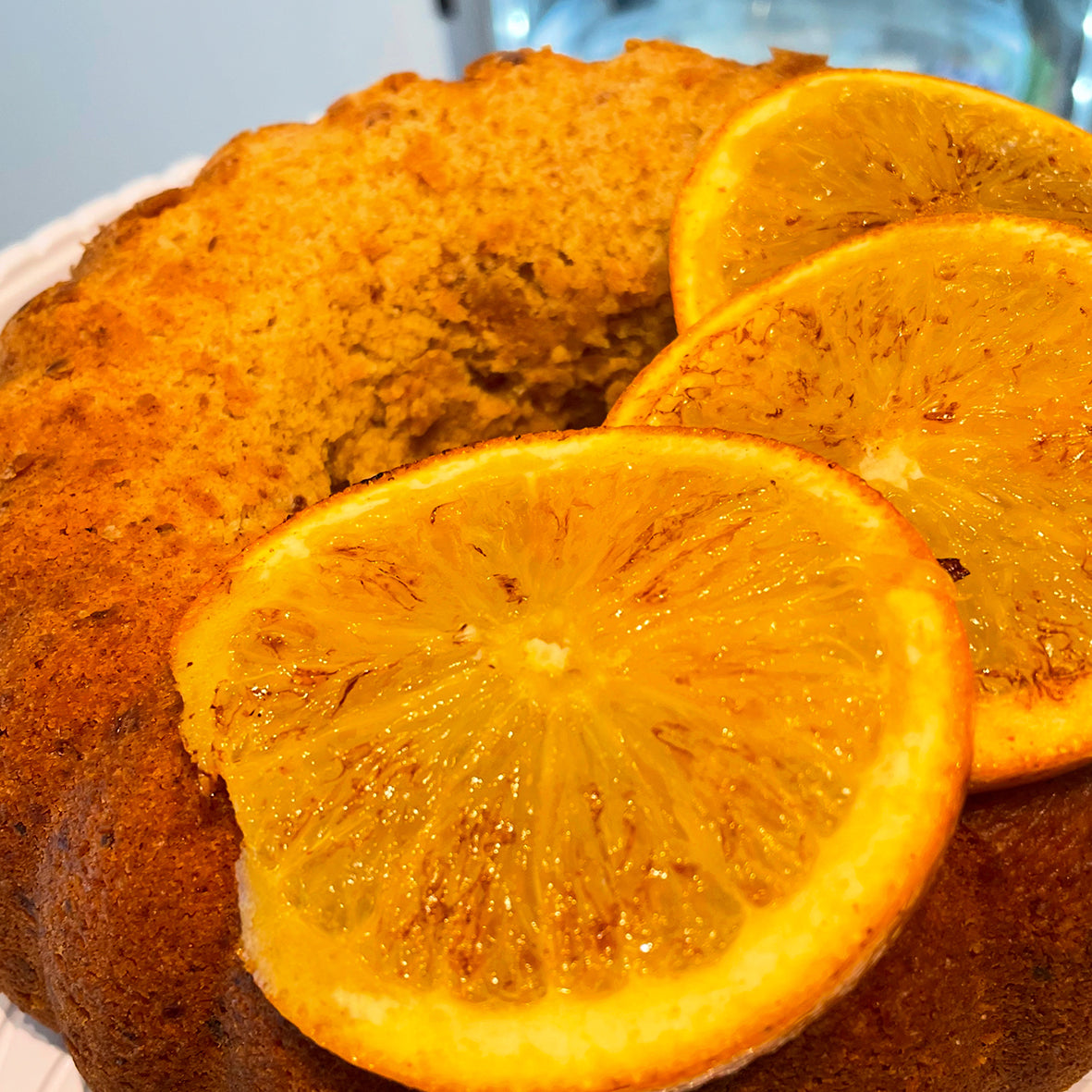 Bolo laranja: laranja Bahia orgânica, farinha de aveia orgânica, tâmara, uva passa branca, amido de milho não transgênico (livre de alumínio e agrotóxicos), manteiga de coco, fermento químico em pó não transgênico (livre de alumínio e agrotóxicos). BOLO SEM OVO