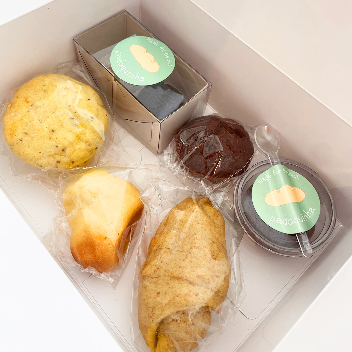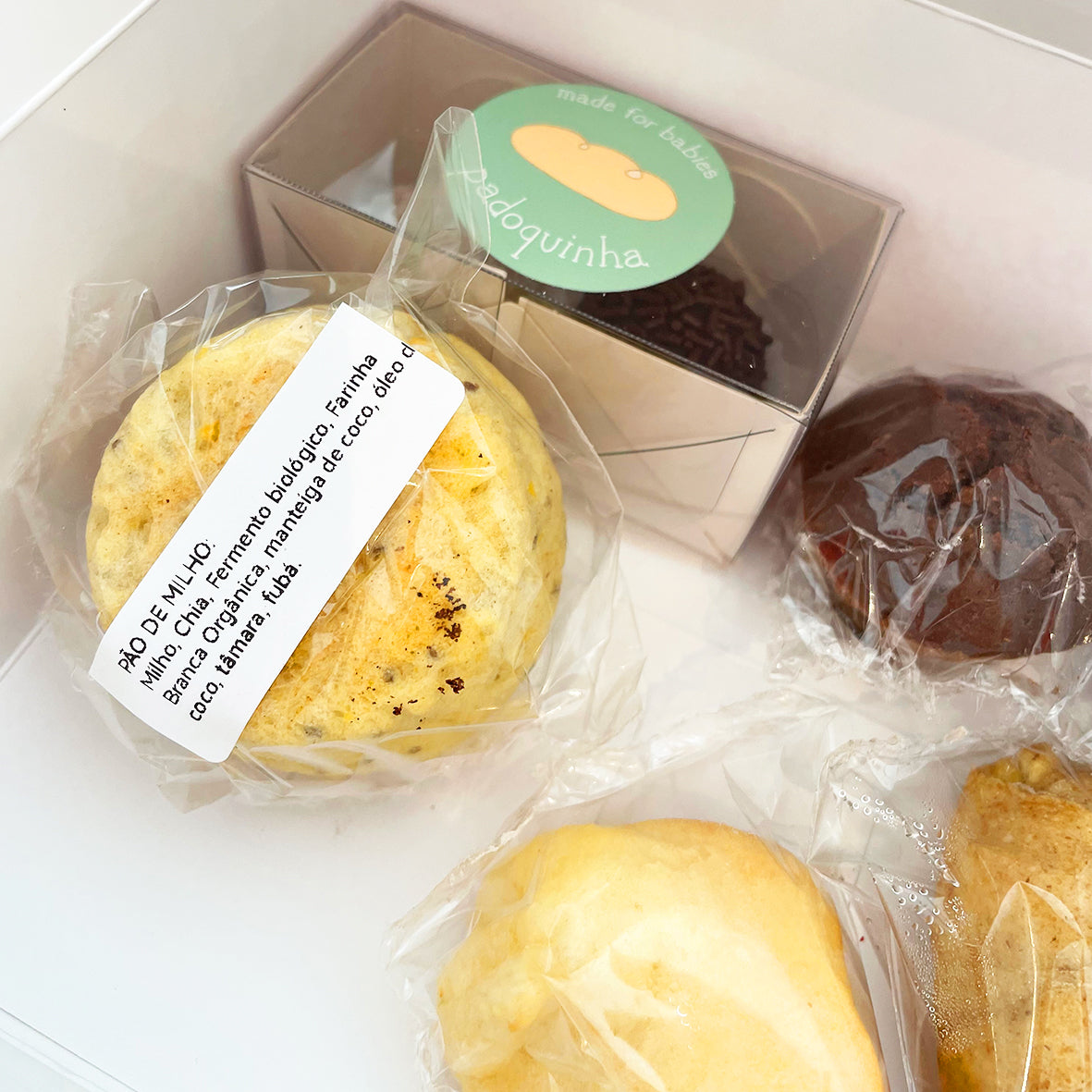 Bolinhos: mirtilo, cacau, cenoura, maçã, banana, laranja, formigueiro ou milho com coco