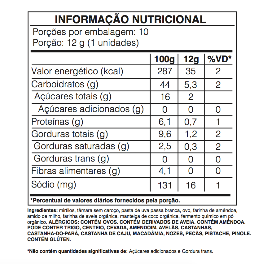 Ingredientes: Mirtilo orgânico, tâmara, uva passa branca, ovo orgânico de galinhas livres, farinha de amêndoas, amido de milho não transgênico (livre de alumínio e agrotóxicos), farinha de aveia orgânica, manteiga de coco, fermento não transgênico (livre de alumínio e agrotóxicos).