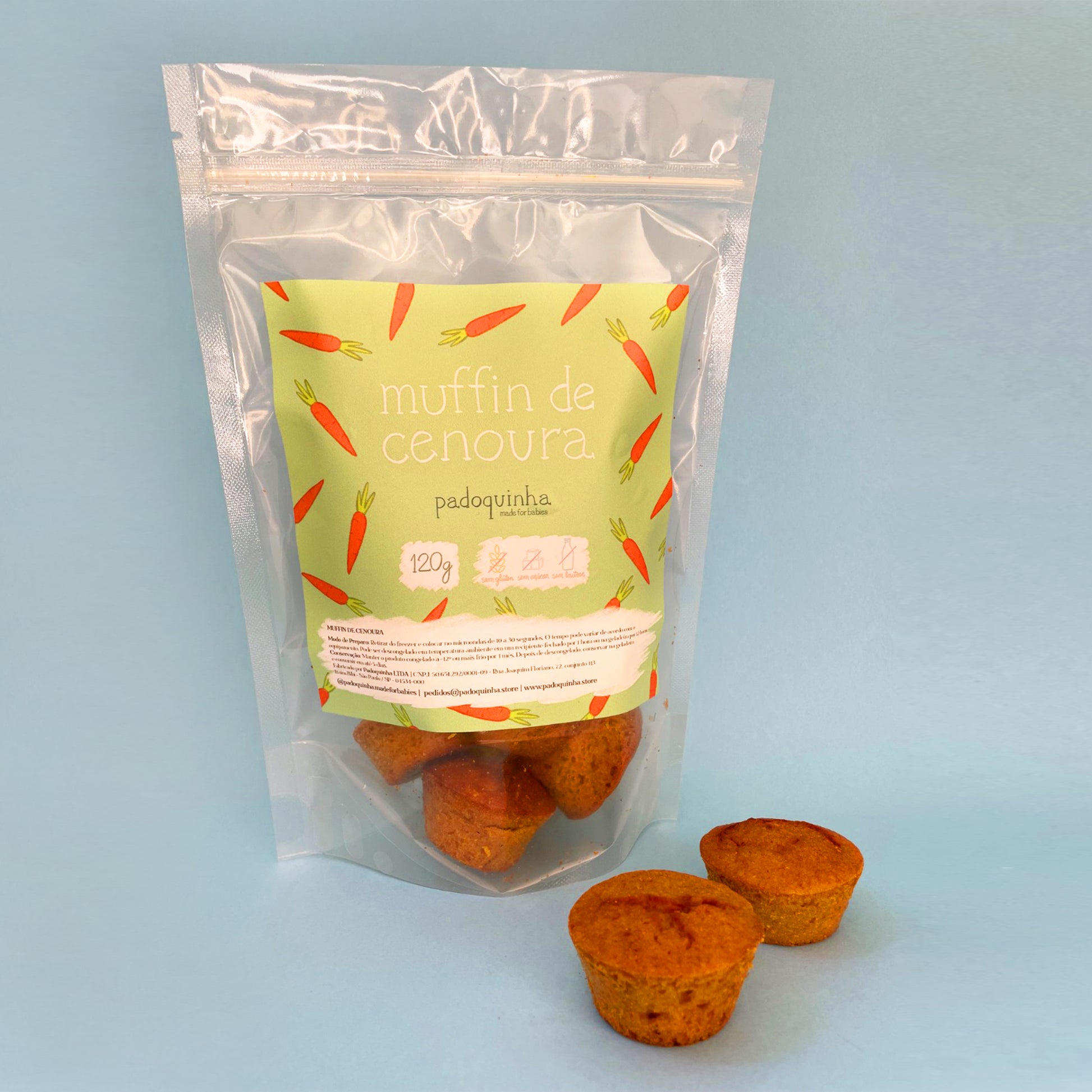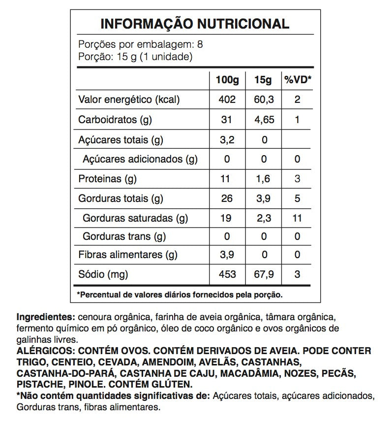 Ingredientes: cenoura orgânica, farinha de aveia orgânica, tâmara, fermento químico em pó não transgênico (livre de alumínio e agrotóxicos) , óleo de coco e ovo orgânico de galinhas livres.