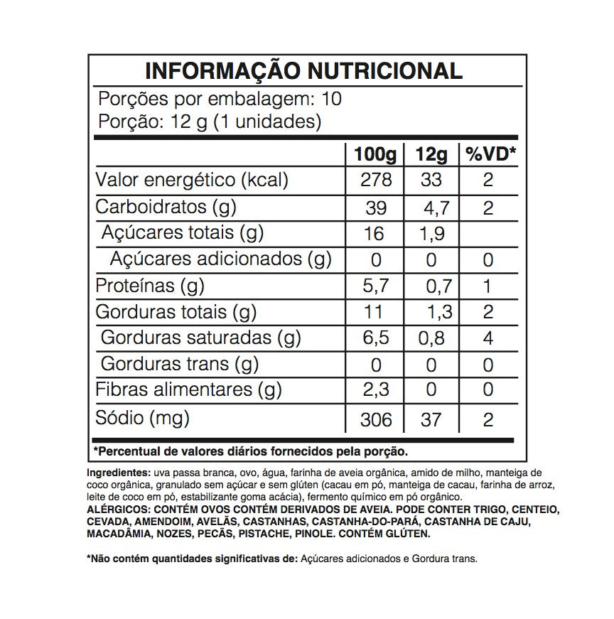 Ingredientes: uva passa branca, ovo orgânico de galinhas livres, farinha de aveia orgânica, amido de milho não transgênico (livre de alumínio e agrotóxicos), manteiga de coco, granulado sem açúcar e sem glúten, fermento químico em pó não transgênico (livre de alumínio e agrotóxicos).